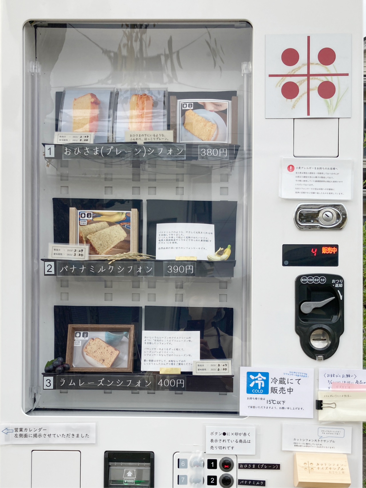 そのため、毎朝丁寧に焼き上げています。 シフォンケーキは、1台1台手作りで作られているため、在庫に限りがありますが、自動販売機では深夜や早朝でも1カットからお求めいただけます。ぜひお近くに立ち寄った際は、ご賞味くださいませ。