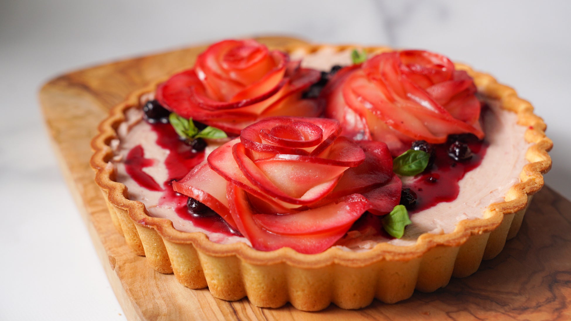 母の日に彩りを添える、華やかなアップルチーズタルト ストロベリークリームチーズのフィリング、カシスのジャム、バターローストした紅玉をたっぷりとデコレーションしました。食べるとほんのりとシナモンが香る、上品なタルトに仕上げています。