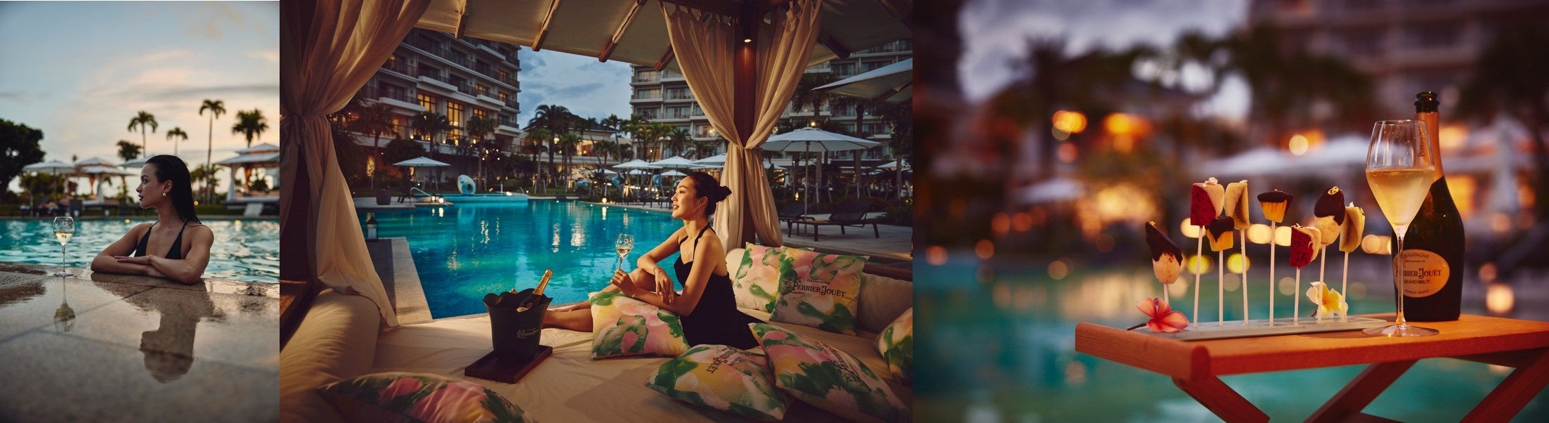 「ナイトプール with ペリエ ジュエ」は、豊かな自然の中にあるサンセットプール内の美しいカバナ(*1)を貸切ることができ、その中で「ペリエ ジュエ」とフルーツチョコレートフォンデュなど(*2)をお愉しみいただける魅力的なプランです。“ベーシックプラン” ではカバナ2時間貸切に「ペリエ ジュエ グラン ブリュット」のフリーフロー付き。“プレミアムプラン”ではカバナ2時間貸切と、プレステージ・キュヴェである「ペリエ ジュエ ベル エポック」フルボトル1本が含まれ、より贅沢な時間を満喫することができます。また、 “トワイライト・プール de シャンパン&カナッペ”では、プールサイドのソファ席で、「ペリエ ジュエ グラン ブリュット」フルボトルと石垣島の食材を使ったシェフ自慢のカナッペをお愉しみいただけます。これらのプランはご宿泊のお客様だけでなくビジターのお客様にもご利用いただけます。詳しくはホテルWEBサイトをご覧ください。(*1&2:プランにより異なります)