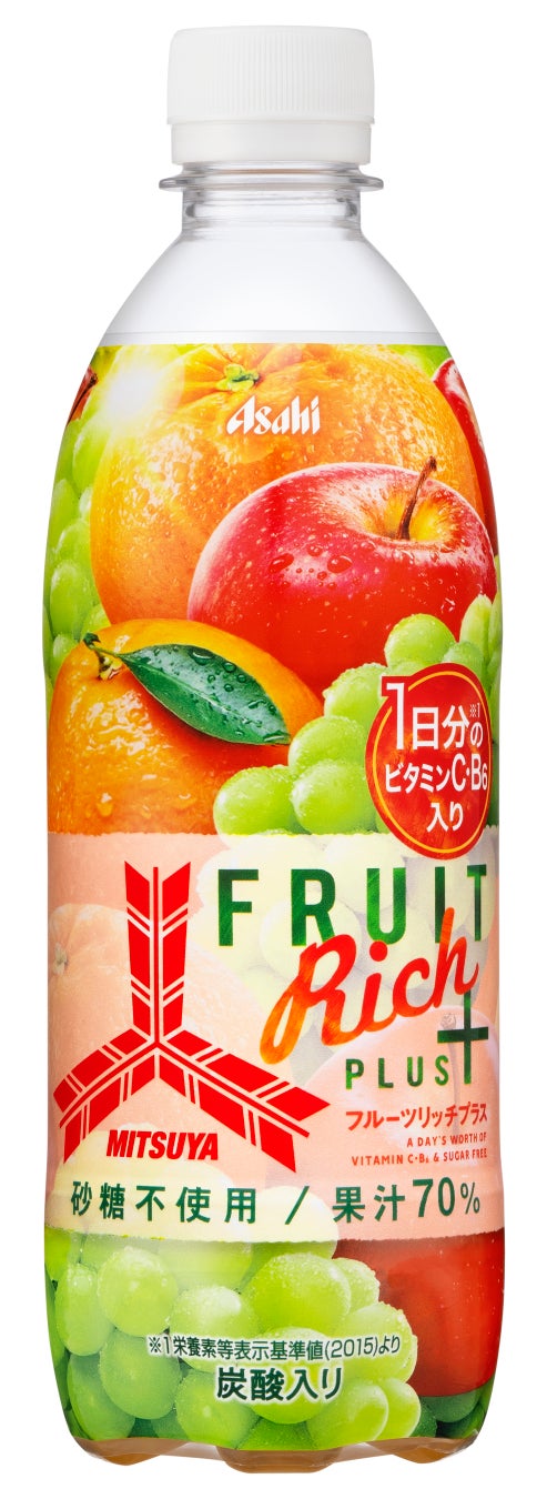 『三ツ矢フルーツリッチプラス』は、ブドウやリンゴ、オレンジといった果汁を70%配合し、砂糖を使用しないことで果実本来の甘みや味わいを贅沢に楽しめる果汁炭酸飲料です。1日分のビタミンCとビタミンB6※を取ることができ、健康的な毎日を過ごしたい方にぴったりな商品です。
