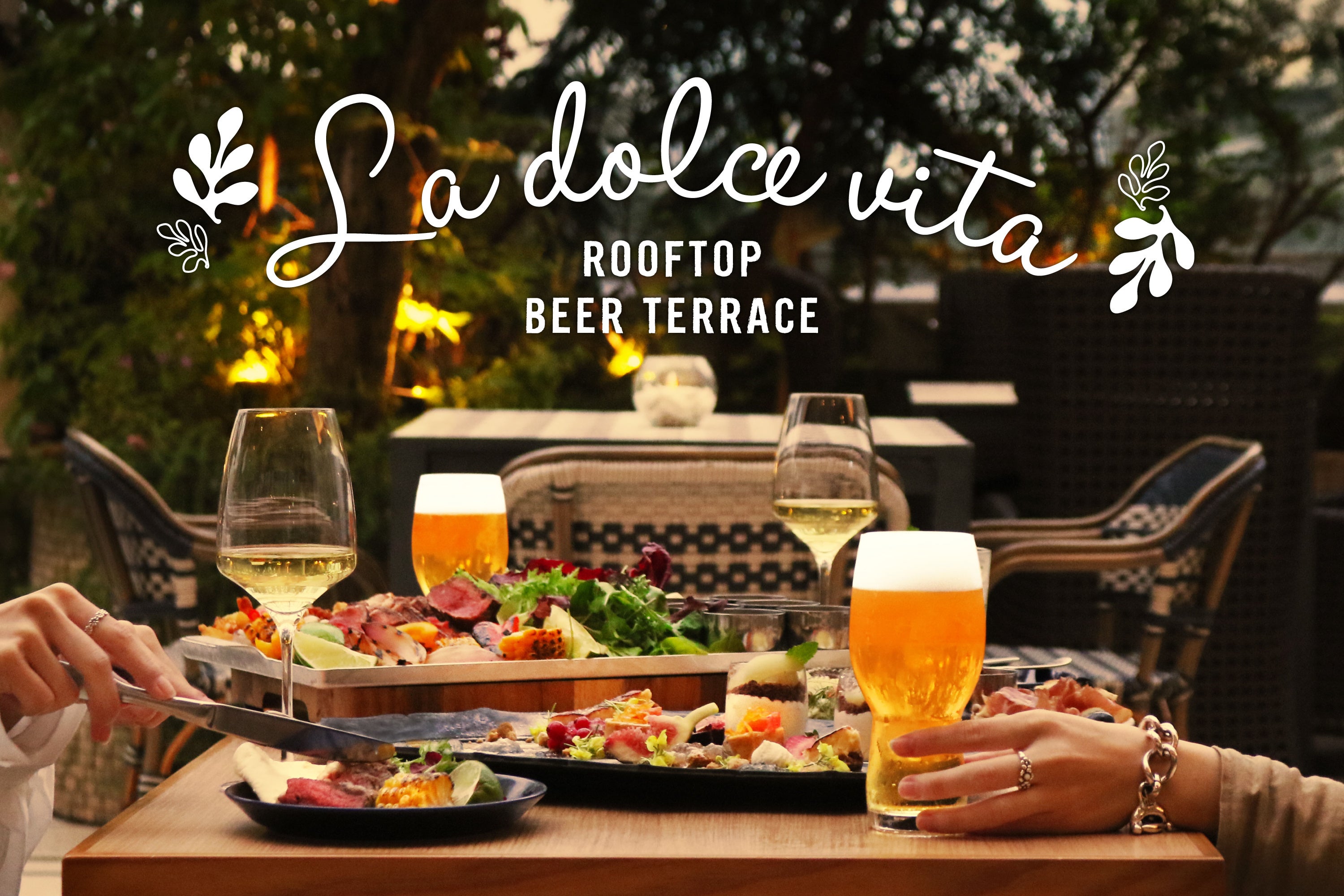 シロノニワのビアガーデンでは、お客様一人一人が日常や都会の喧騒から少し離れて「dolce vita」の感覚で、友人や恋人、家族とのお食事をまるで海外にいるような屋上庭園の心地よい空間で心ゆくまでお楽しみください。