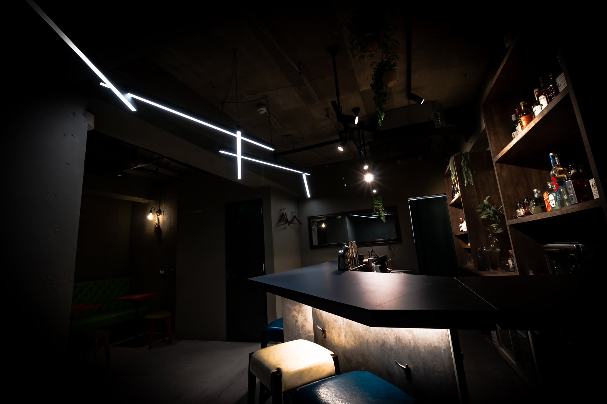 入口のイメージとは一転して、蛍光色のライトが印象的な現代的なデザインのバーがゲストを迎える。
