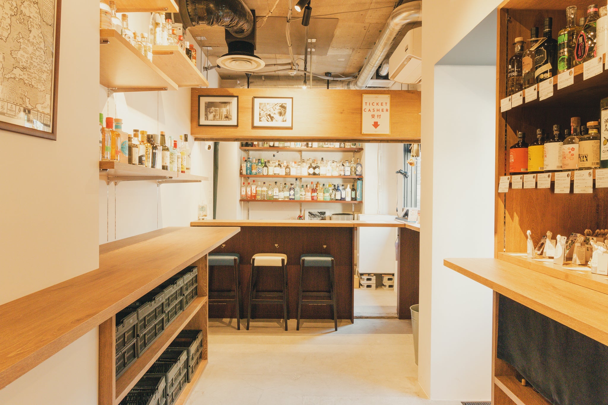 クラフトジンを気軽に楽しんで欲しいという代表の想いから、前店舗のデザインをそのまま活かし、白色を基調とした店内で、温もりを感じるウッドテイストに仕上がっています。
