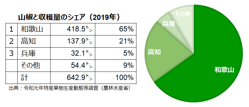 山椒の収穫量の約65%を占める和歌山県の中でも、有田川町がトップの生産量を誇っています。しかし、全国の山椒の収穫量は、農家の高齢化等の影響により、2015年に1,099㌧あったものが、2019年には643㌧にまで急速に落ち込んでおり(※)、日本独自のスパイスである山椒の生産は危機的な状況に陥っています。