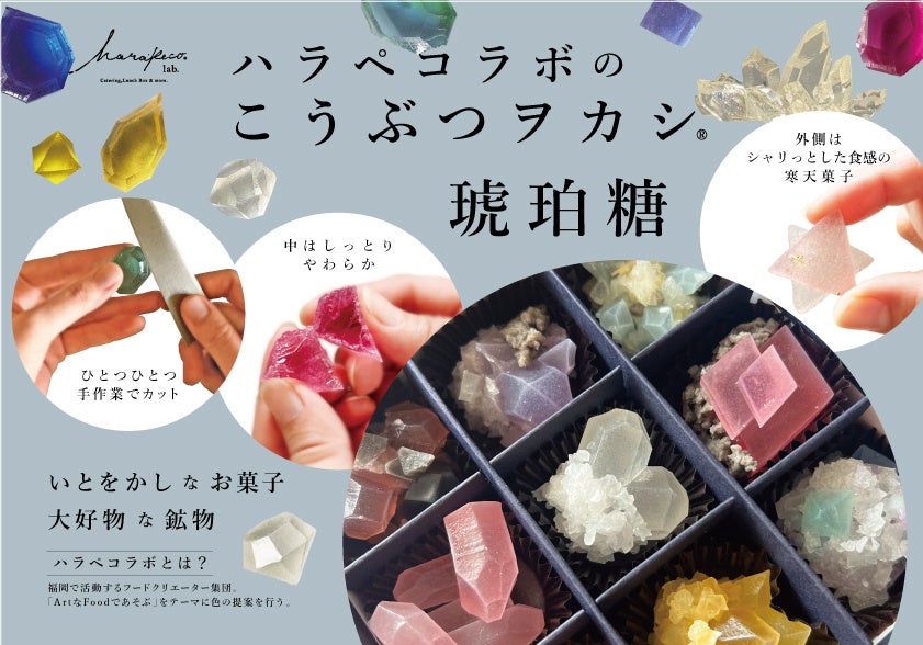 2017年より福岡市南区にアトリエを構え、「ArtなFoodであそぶ」をコンセプトに、代表作の鉱物みたいなお菓子「こうぶつヲカシ」(琥珀糖)を制作、また近郊へケータリングやobentoを制作し、自宅でも簡単に食とアートを楽しんでもらうための「オリジナルグッズ」を展開しているメルティングポットハラペコラボ株式会社(所在地:福岡県福岡市、以下ハラペコラボ)が母の日向けた商品を開発。