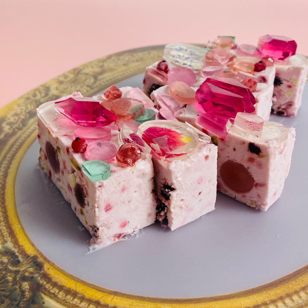 カシス・ピーチココナッツ・ラズベリー味の琥珀糖がアクセントとなり、ナッツの香ばしさがクリームの美味しさを引き立て、口の中で豊かに広がります。