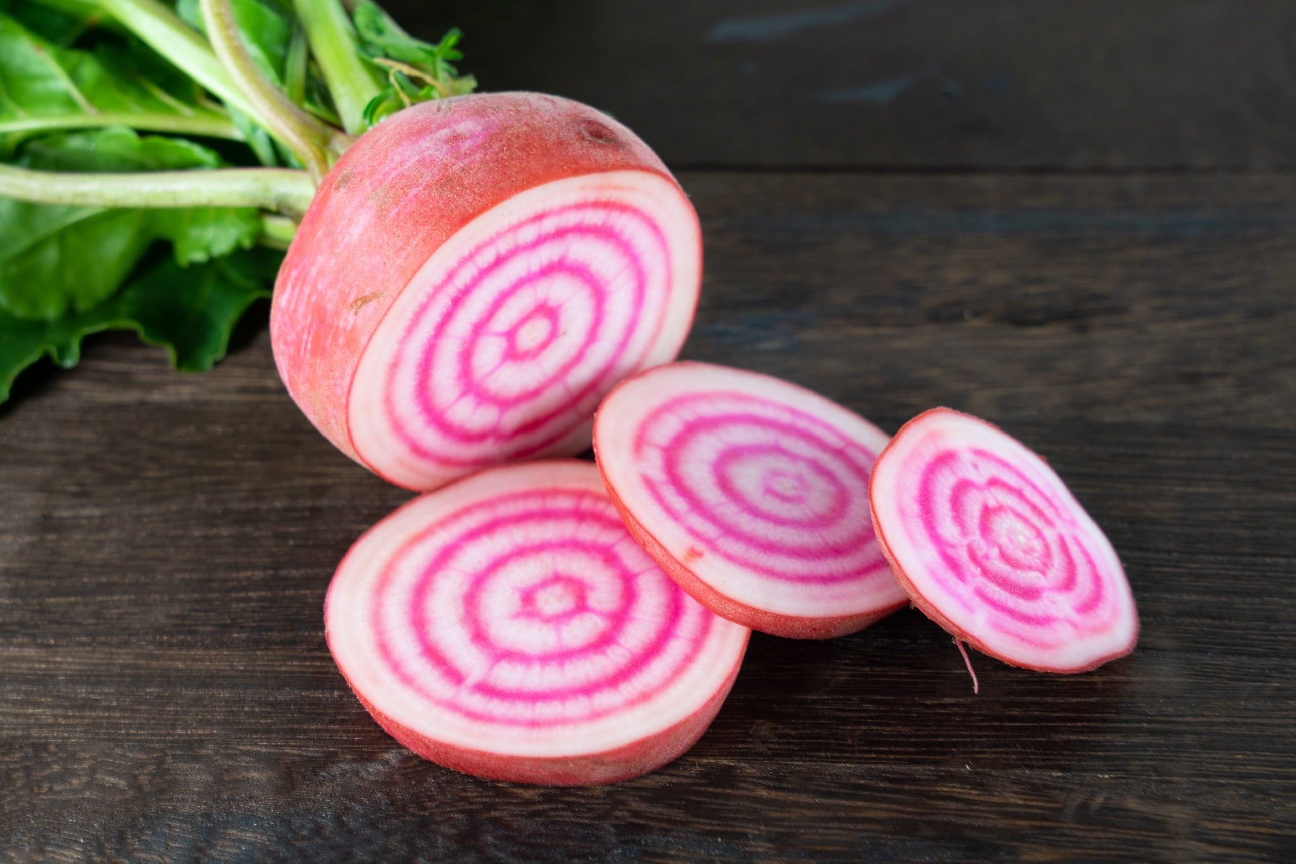 ゴルゴは、イタリア原産のビーツで、鮮やかな渦巻き模様が特徴です。その鮮やかな模様を生かしてサラダやピクルスに使われます。