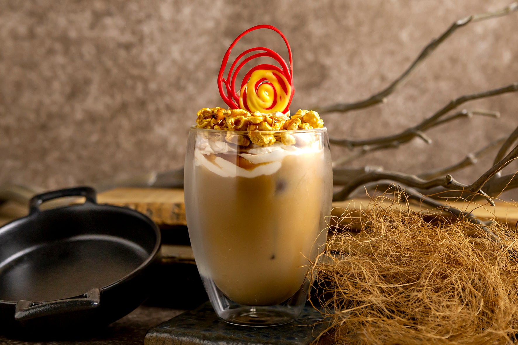 火の悪魔をチョコレートで表現し、キャラメルポップコーンで暖炉の薪をイメージした甘いキャラメルオーレ。
