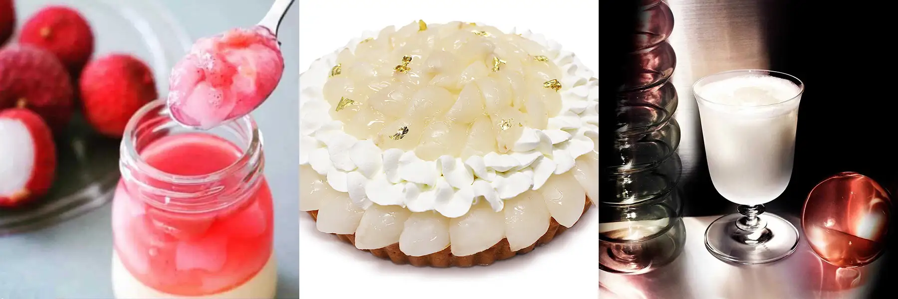 ▲左から、宮崎県『南国プリン』様の「新富ライチプリン」、東京都『カフェコムサ』様の「宮崎県新富町産“生ライチ”のケーキ」、東京都『BAR 石の華』様の「国産ライチ×ココナッツのペインキラー ~Bar石の華オリジナル・レシピ~」