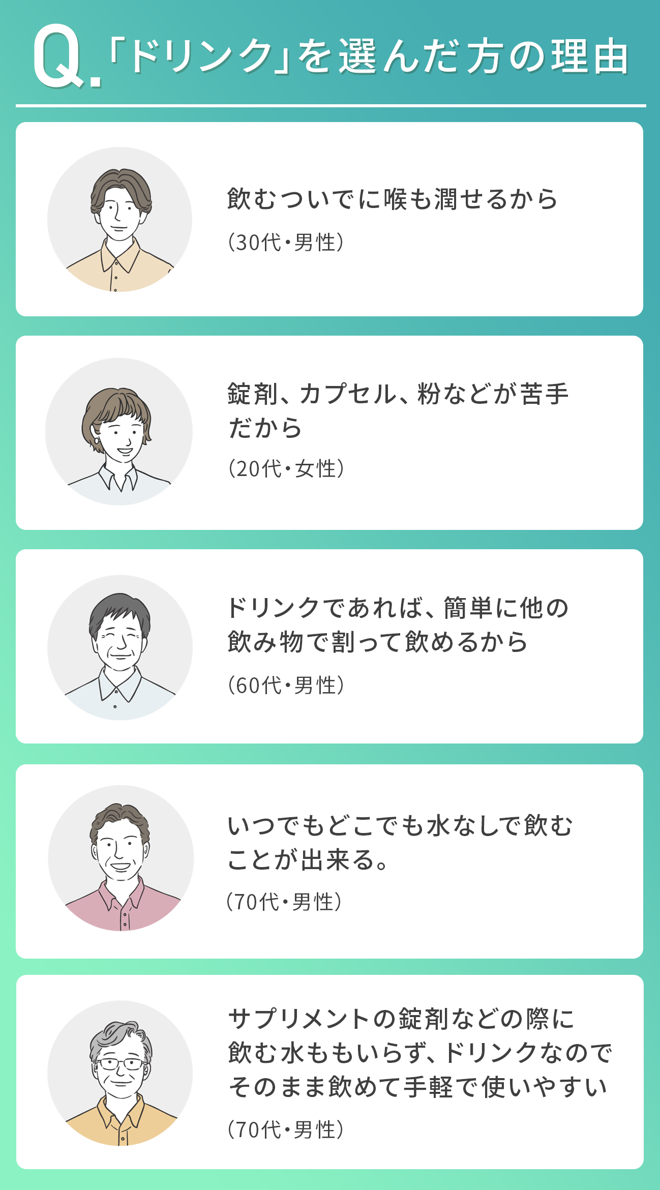「ドリンク」はそのまま手軽に飲み込める点が魅力に感じている方が多いようです。