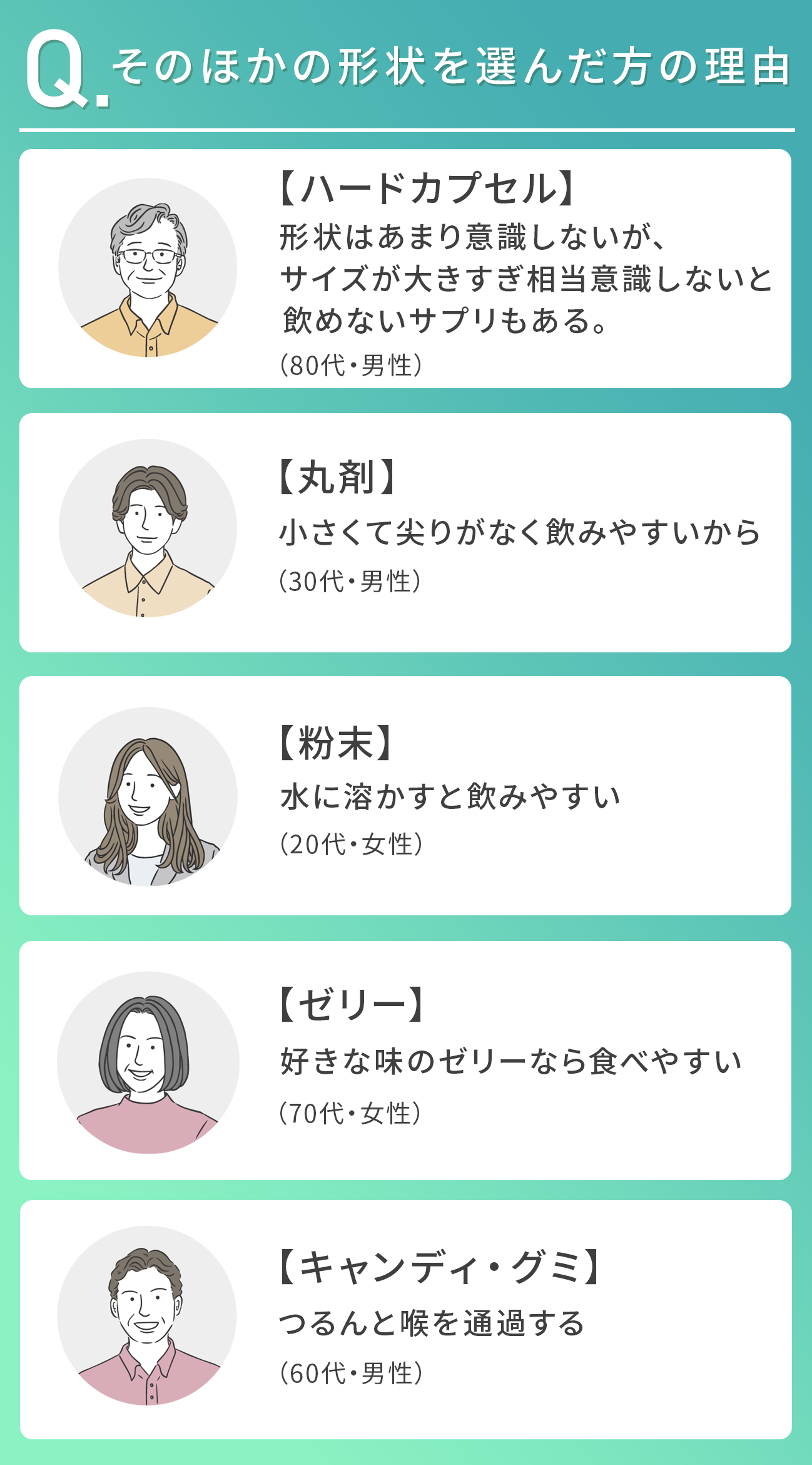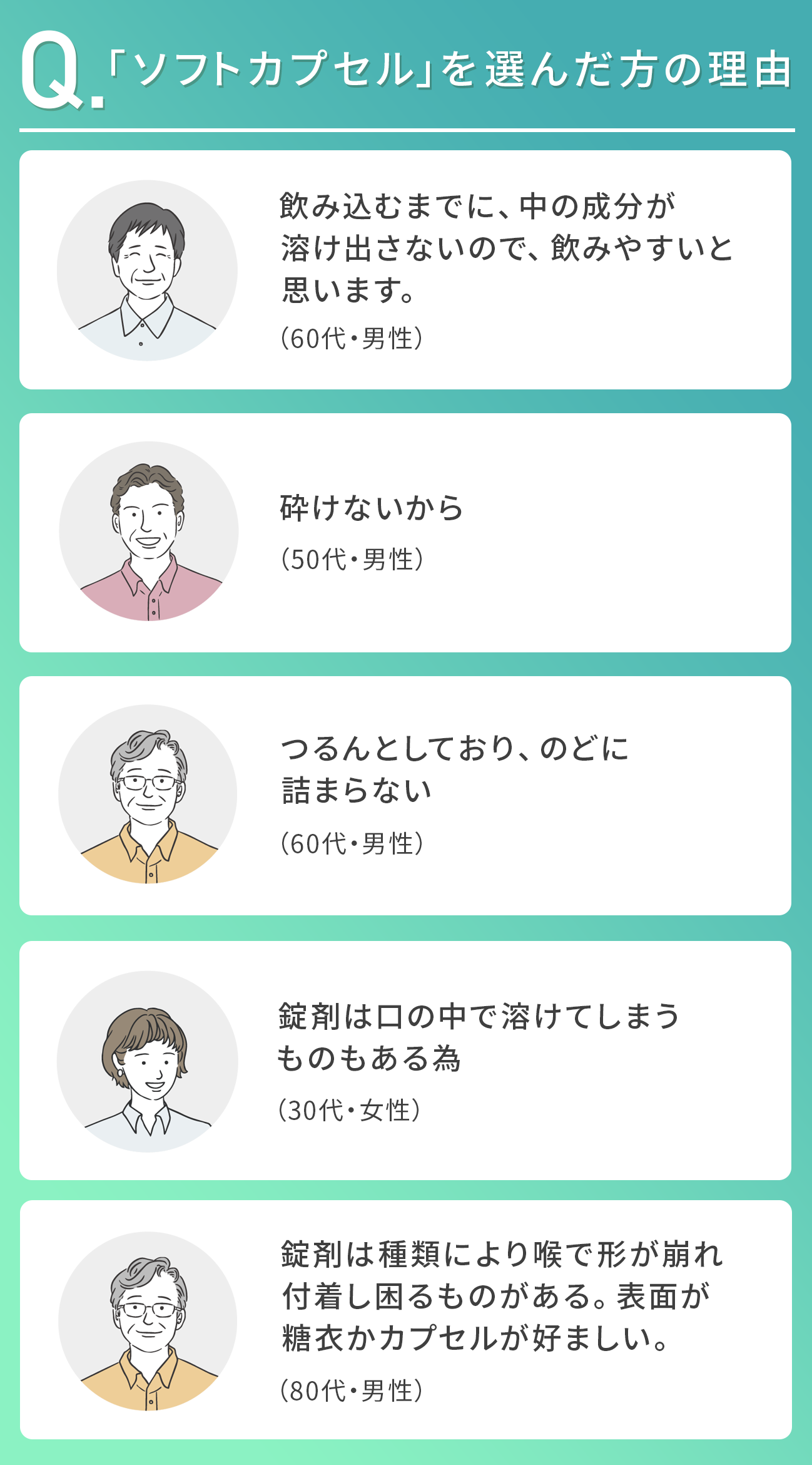 「ソフトカプセル」を選んだ方は、錠剤が口の中で溶けてしまう点を懸念している方が多いようでした。