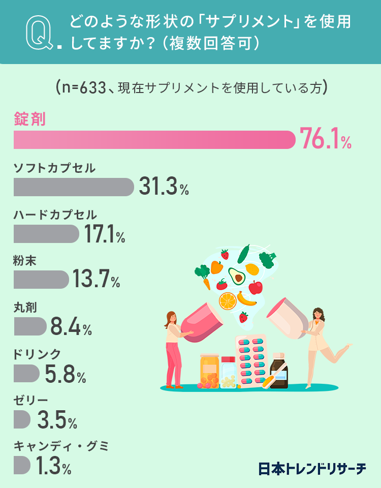 76.1%と、大半の方が「錠剤」のサプリメントを使用していると答えました。
