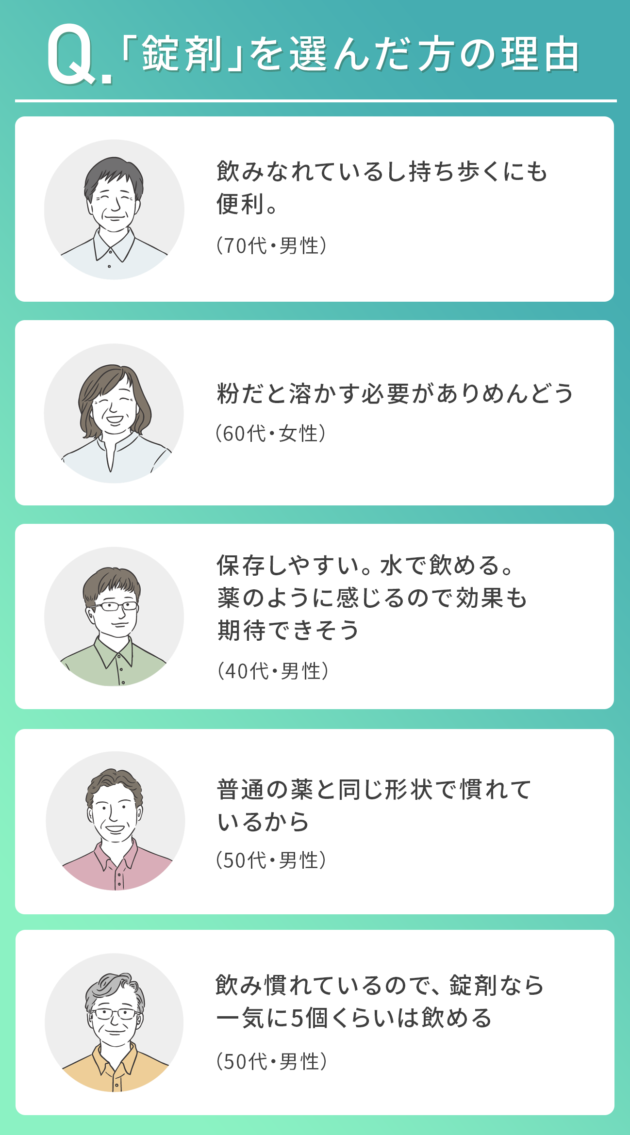「錠剤」は飲みやすく保存しやすい点がメリットだと考えている方が多いようです。