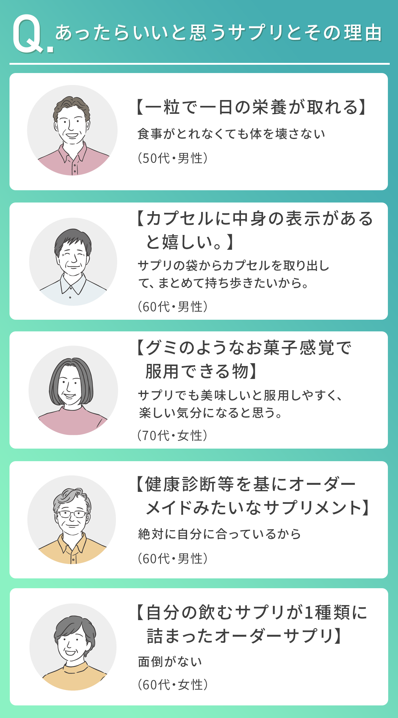 また、どのようなサプリメントがあれば嬉しいと感じているのでしょうか。