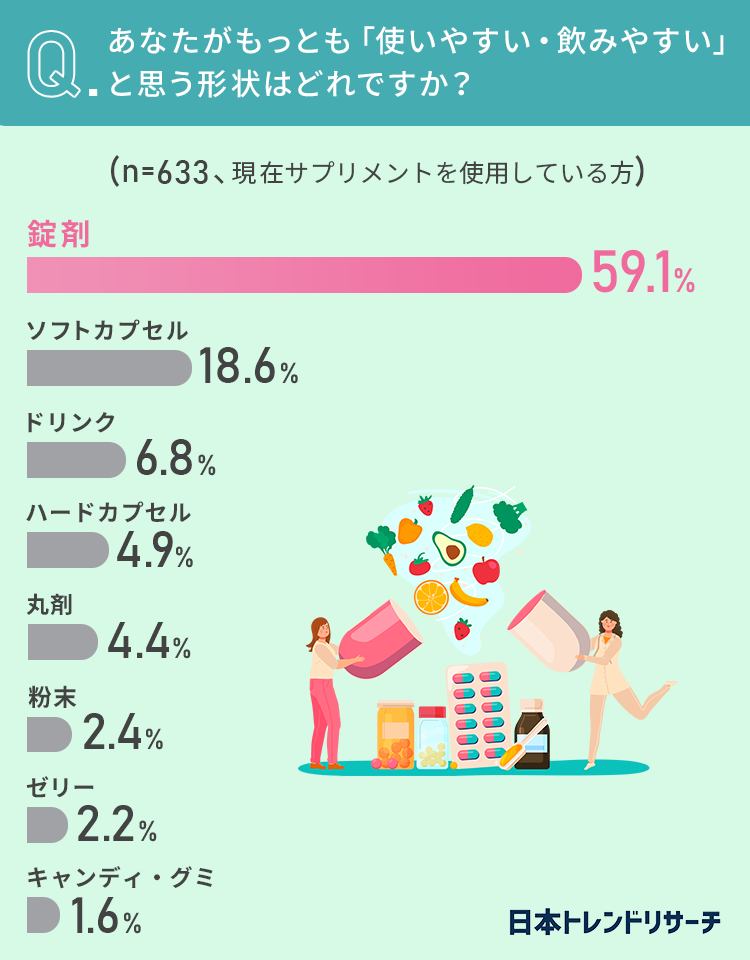59.1%と、半数以上の方が「錠剤」がもっとも「使いやすい・飲みやすい」と思っているようです。