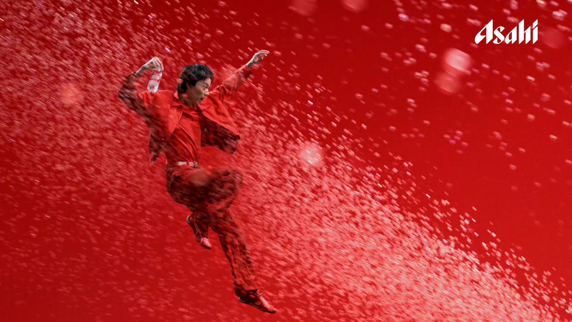 真っ白な空間に、全身を“白”の衣装に身を包んだ菅田さんが『ウィルキンソン タンサン』を持って登場します。菅田さんが『ウィルキンソン タンサン』を開けると大量の泡が噴き出し、真っ白な空間が『ウィルキンソン タンサン』のテーマカラーである“赤”へと一気に染まります。強炭酸の刺激に引き込まれるように、菅田さんがジャンプすると身体が泡に包まれ、“白”の衣装が一瞬で“赤”の衣装に変化します。「この先100年も、赤い刺激と生きていく」というナレーションとともに『ウィルキンソン タンサン』を飲む菅田さんの表情からは、ブレない強い意思が感じられ、『ウィルキンソン タンサン』の100年続くブレない刺激を表現しています。