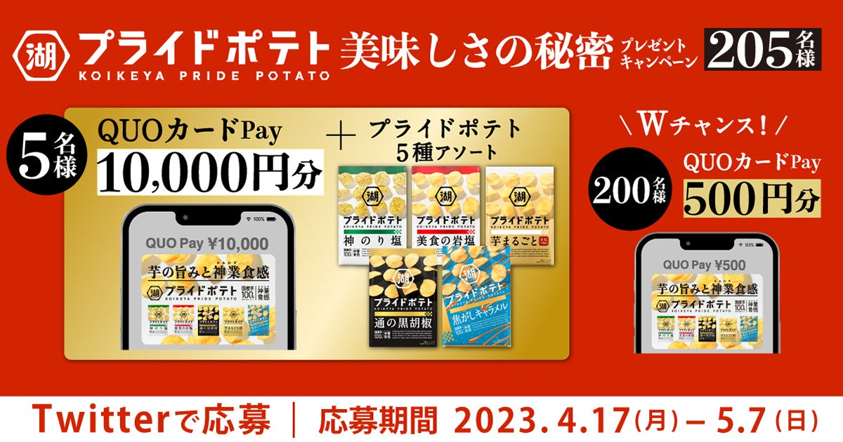 待ちに待った「湖池屋プライドポテト 焦がしキャラメル」の発売を記念して、オリジナルQUOカードPayや「湖池屋プライドポテト」の詰め合わせが当たるTwitterキャンペーンを実施します。よりおいしく進化した「湖池屋プライドポテト」の“美味しさの秘密”を投稿し、ぜひご応募ください。