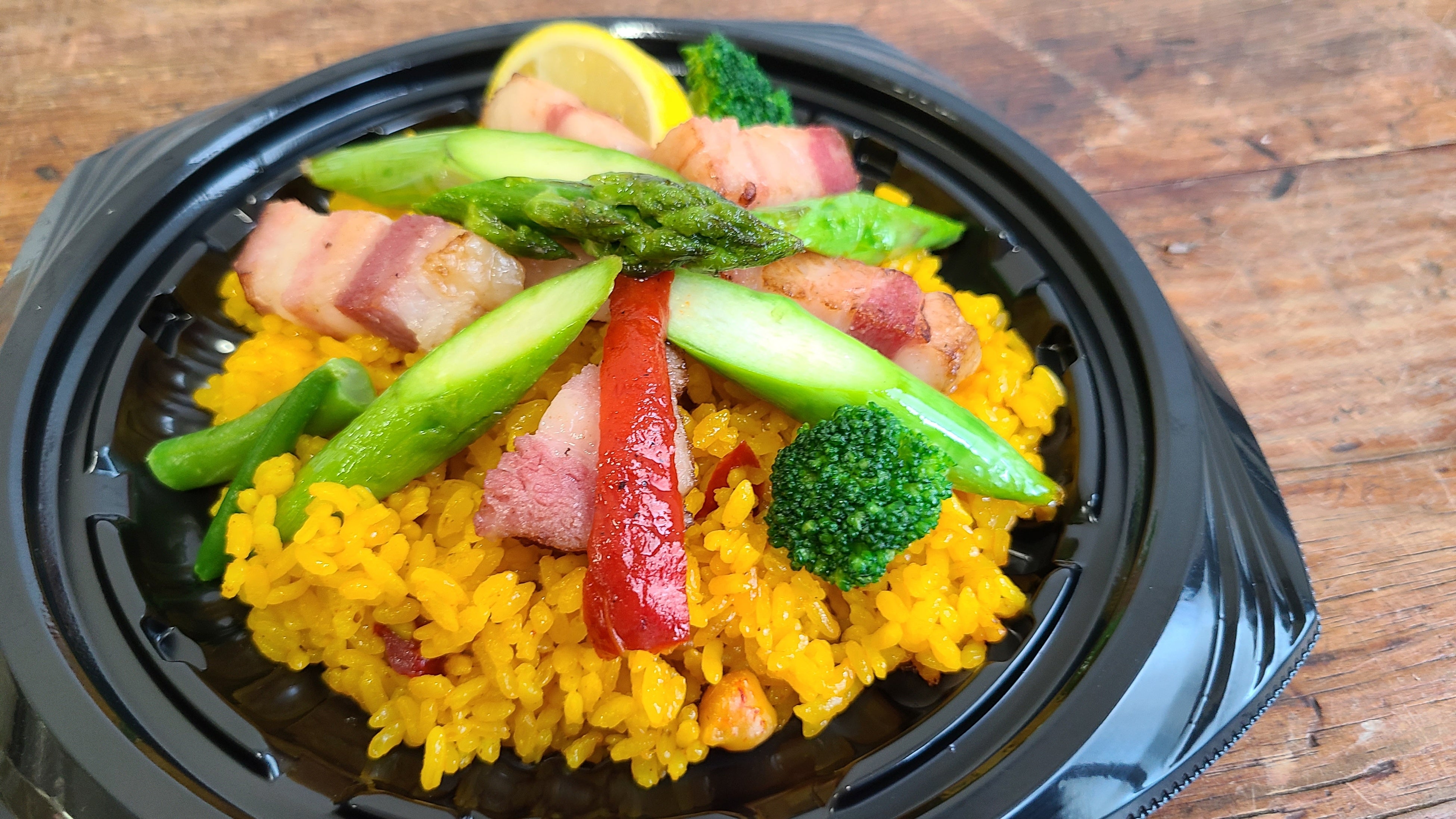 シーフードパエリアやイベリコパエリアが定番ですが、今回は本催事限定で「さぬきのめざめ」とスペイン産イベリコ豚を原料にしたベーコンを使用したパエリアが登場。イベリコ豚特有の肉の旨みと脂の甘みが「さぬきのめざめ」の持つ食感と旨みが合わさり、オリジナルレシピで炊き上げたパエリアと絶妙にマッチしています。
