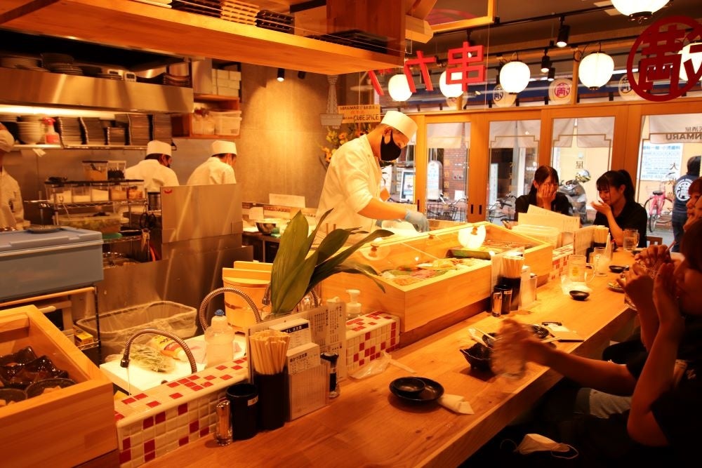 満マルでは創業以来、多くのメニューを「手作り」しています。特に串カツと握り寿司は満マル名物!串カツは具材を串に刺すところから店舗で行い、衣までがオリジナル。寿司は職人が握り、酢飯やネタの仕込みにもこだわっています。その他、焼き物・揚げ物など全200以上の品揃え!食を通じ、皆様に「笑顔」「元気」「感動」を提供し続ける事がモットーの満マル!ぜひお誘いあわせの上、ご来店ください。