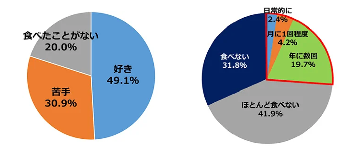 羊肉を食べたことのある人が羊肉を食べる頻度について、「日常的に」は2.4%、「月に1回程度」4.2%、「年に数回」19.7%、「ほとんど食べない」41.9%、「食べない」が31.8%という結果に。約半数が「好き」と答えていながら、頻度として年に複数回食べる人が4人に1人程度(26.3%)ということがわかりました。