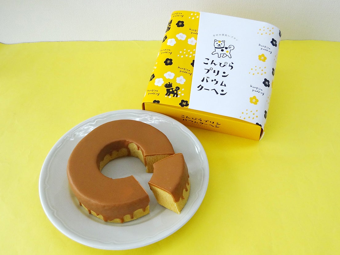 ラ・ファミーユが手がけるプリン専門店「こんぴらプリン」の新商品。卵と生クリームたっぷりの濃厚バウムクーヘンにキャラメルチョコレートをかけて仕上げました。