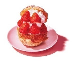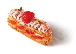 パイ生地、シュー生地、クッキー生地3層の生地にクリームと苺を贅沢に盛り付け。