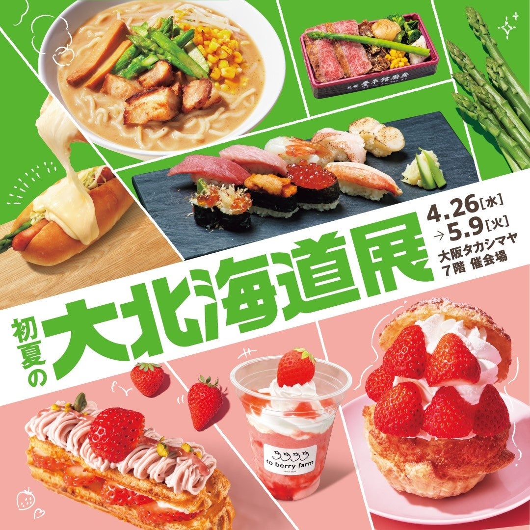 高島屋大阪店では、若年層やファミリーなど幅広いお客様にご来店いただくために、4月26日(水)→5月9日(火)のゴールデンウィーク期間に合わせ「初夏の大北海道展」を開催します。今がまさに旬の「アスパラガス」、北海道にもあった甘い「いちご」にスポットをあて、アスパラガスやいちごを使った惣菜やスウィーツを特集します。また、LIVE感溢れる「できたて」「つくりたて」の北海道グルメから、高島屋限定商品約40点をご用意し“ここでしか買えないグルメ”を強化します。また、催会場以外でも「旭山動物園とのコラボイベント」や「食料品売場・レストランフロアでの道産グルメ」など北海道の魅力を店内で発信します。
