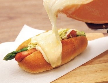 十勝温泉水で磨きあげたラクレットチーズの波がとろりと押し寄せる、アスパラガスを挟んだホットドッグ。
