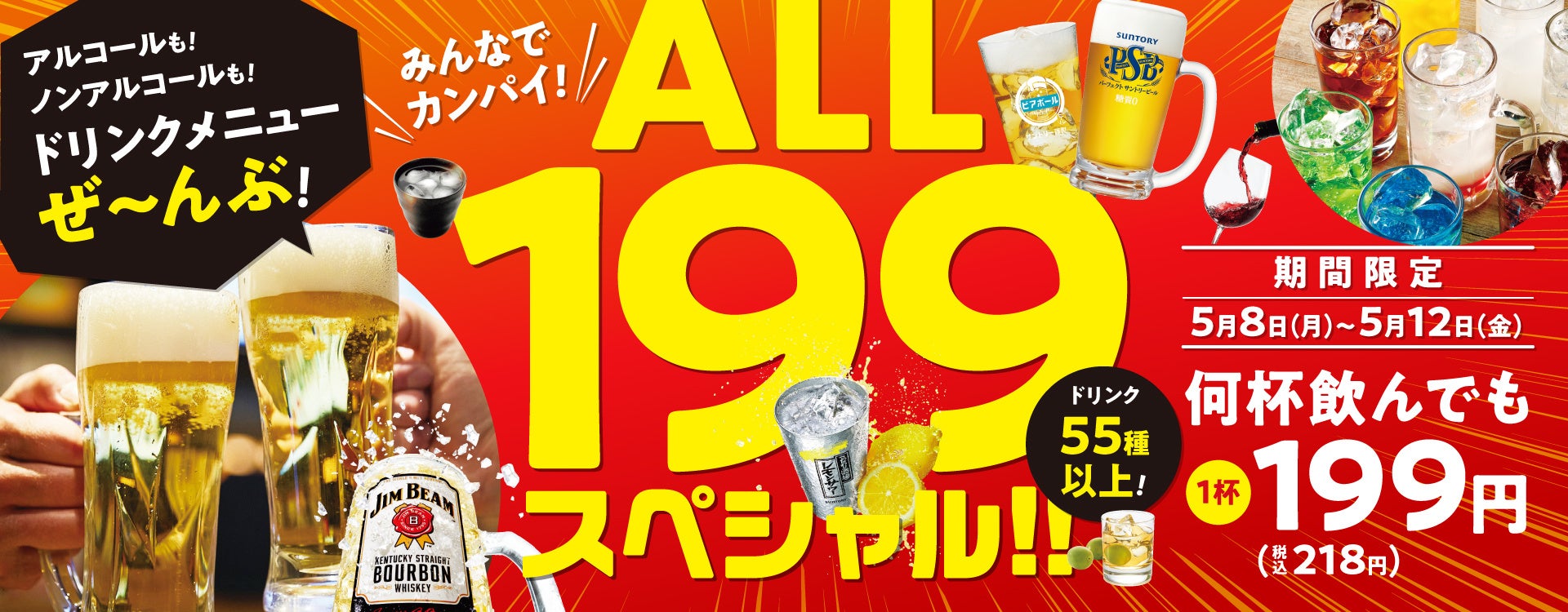 この「みんなでカンパイ!ALL199スペシャル」で、新生活の始まりに出会った新たな友人や仲間同士、老若男女問わず外食をしながら笑顔で未来を語り、新たな時代の幕開けに「みんなでカンパイ!」をしていただければと思います。是非この機会にお立ち寄りください。