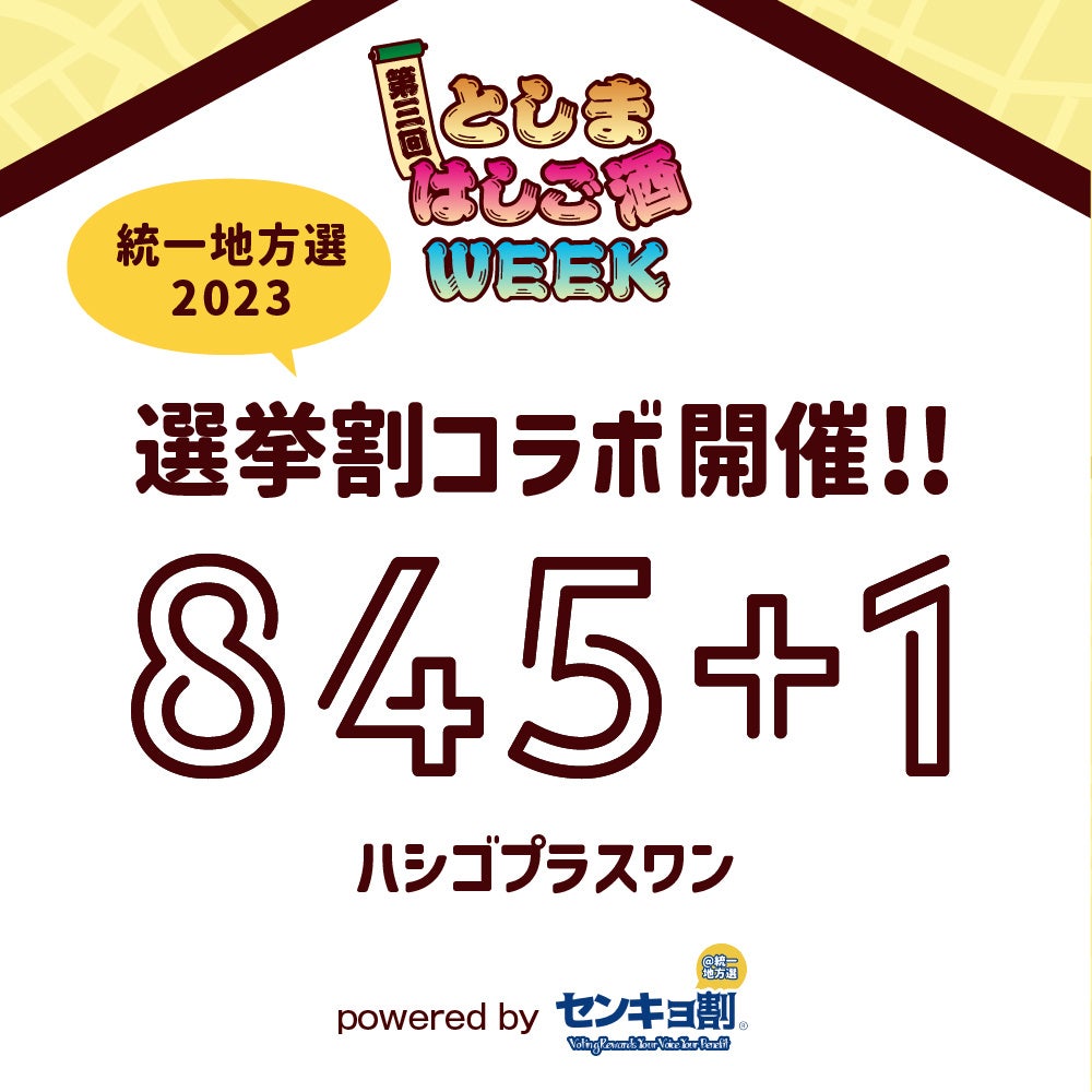 第3回としまはしご酒WEEKでは、一般社団法人選挙割協会と提携して『845+1 powered by センキョ割』を実施いたします。こちらは、2023年4月実施の統一地方選に向け「選挙をポジティブに捉えられる国民的行事にするため、選挙割文化で社会参加意識向上のきっかけを作る」 を理念とする一般社団法人選挙割協会に当イベントが賛同しての提携企画です。