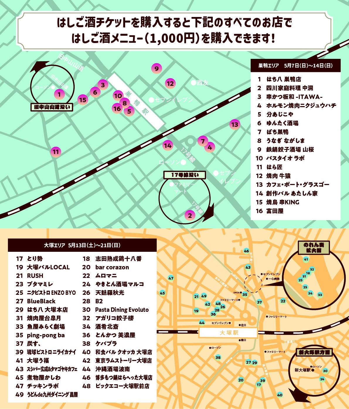 (※)昼飲み開催:5月13日(土)から5月14日(日)※巣鴨、大塚エリア同時開催