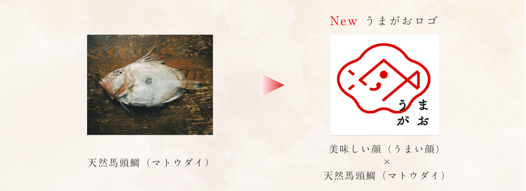 原料の馬頭鯛を現した魚が、うまがお=美味しい顔の表情をしている様を表現しました。