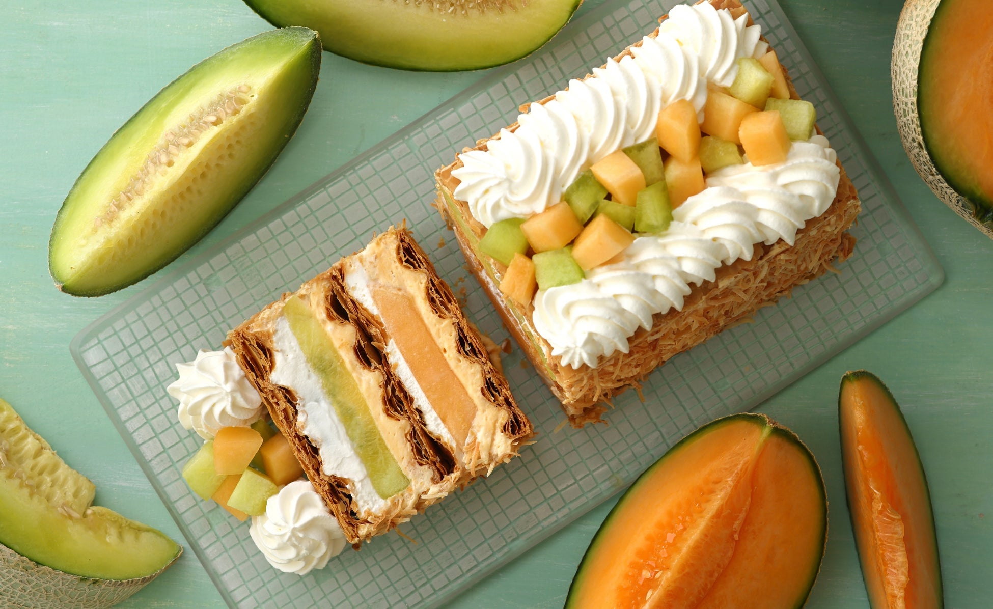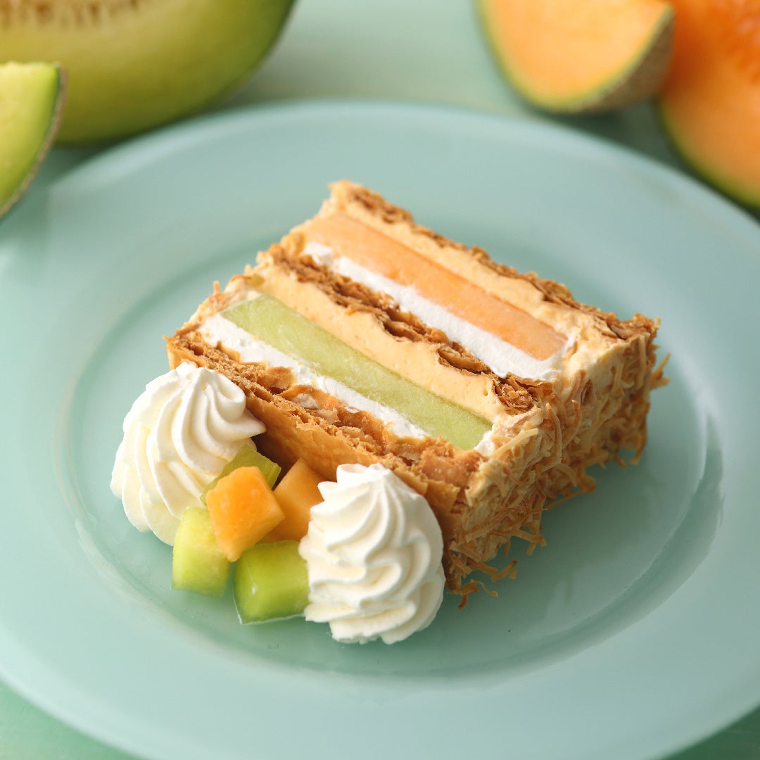 マイルドで上品な甘みと果肉感のある“赤肉メロン”と、とろける甘みが際立つ芳醇な香りの“青肉メロン”。2種類のメロンを、サクサクパイ生地で贅沢に味わう一品です。