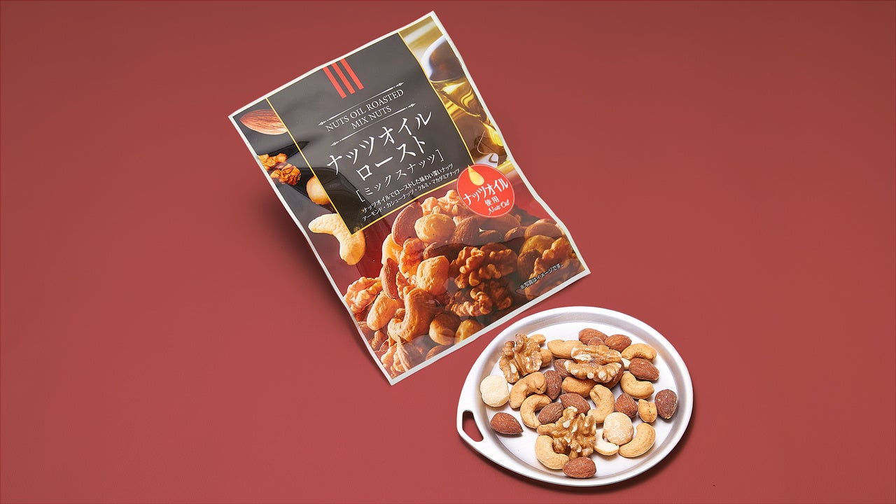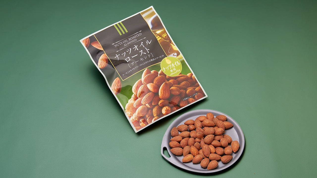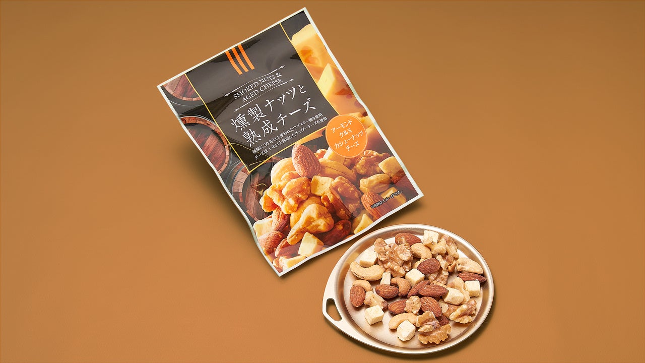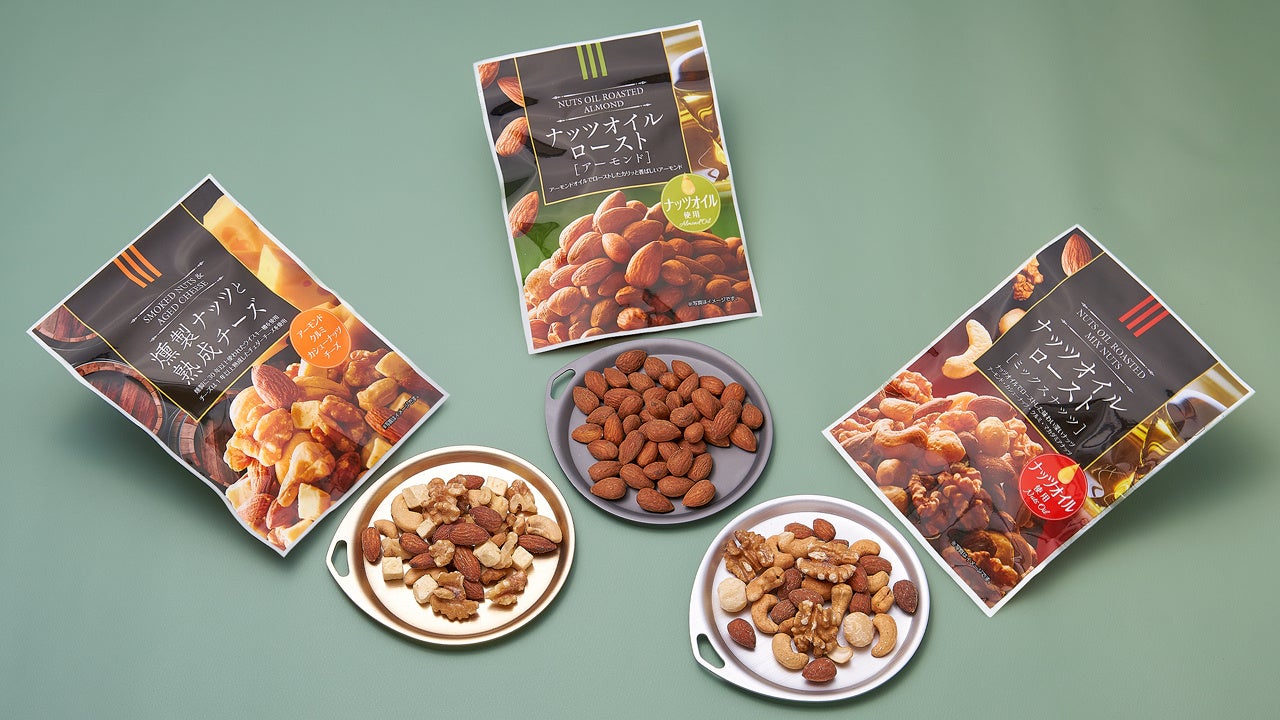 4月26日(水)に発売するナッツ3種は、素材や製法を工夫することでワンランク上の味を提供します。「ナッツオイルロースト アーモンド」、「ナッツオイルロースト ミックスナッツ」は「オイルロースト法」を採用。ローストすることで水分が抜けてカリッとした食感になり、香ばしさが加わります。さらに、なたね油などの植物油は使用せずナッツオイルのみでローストするため、ナッツ本来の味わい深さが増しています。アーモンドは肉厚で味と風味に優れた「ビュート種」を使用。ローストとの相性もよく、深い味わいが楽しめます。「燻製ナッツと熟成チーズ」は、ウィスキー樽として使用されていたチップで燻製することで、スモーキーな香りや深い味わいが楽しめる仕様になっています。熟成チェダーチーズとの相性も良く、お酒のお供におすすめです。いずれも、食べきりサイズで本体価格200円(税込216円)とお手頃価格に設定しました。