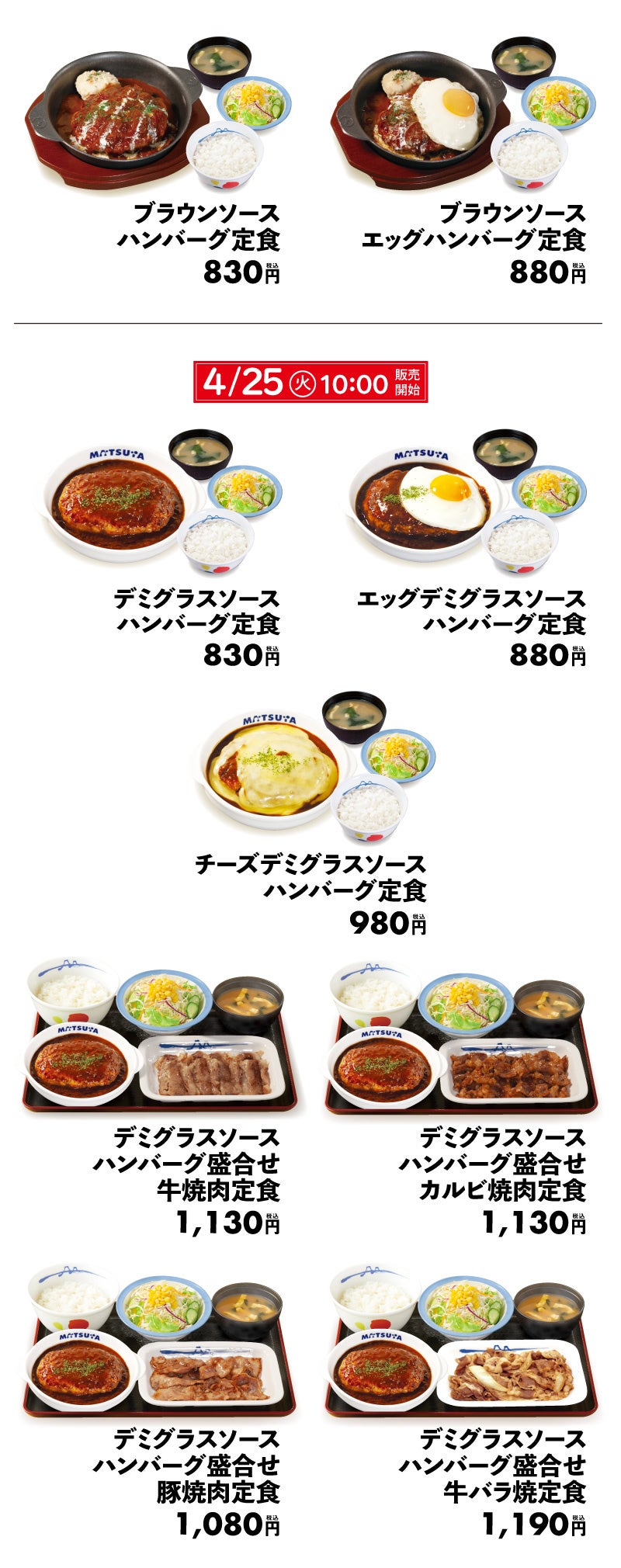 | 商品名 デミグラスソースハンバーグ定食 830円 エッグデミグラスソースハンバーグ定食 880円 チーズデミグラスソースハンバーグ定食 980円 デミグラスハンバーグ盛合せ豚焼肉定食 1,080円 デミグラスハンバーグ盛合せ牛焼肉定食 1,130円 デミグラスハンバーグ盛合せカルビ焼肉定食 1,130円 デミグラスハンバーグ盛合せ牛バラ焼定食 1,190円 ※お持ち帰りいただけます。お持ち帰りにみそ汁は付きません。 お持ち帰りの場合、みそ汁は別途60円でお求めいただけます。 ※税込み価格です。 発売日 2023年4月25日(火)午前10時 ~ |