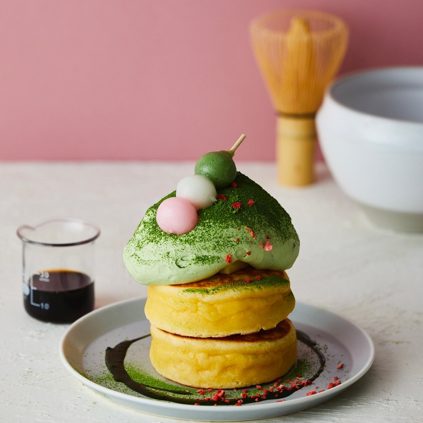 晩春から初夏へ移り変わる季節にぴったりな限定メニューとして、新緑を思わせる色合い鮮やかな「抹茶ビスケットホットケーキ」が新登場。お団子がのった見た目が可愛らしく、別添えの黒蜜をかけて食べればさらに和を感じて頂ける一皿です。西尾の抹茶マスカルポーネクリームや抹茶シロップを使用した濃厚な抹茶シェイクも同時展開いたします。