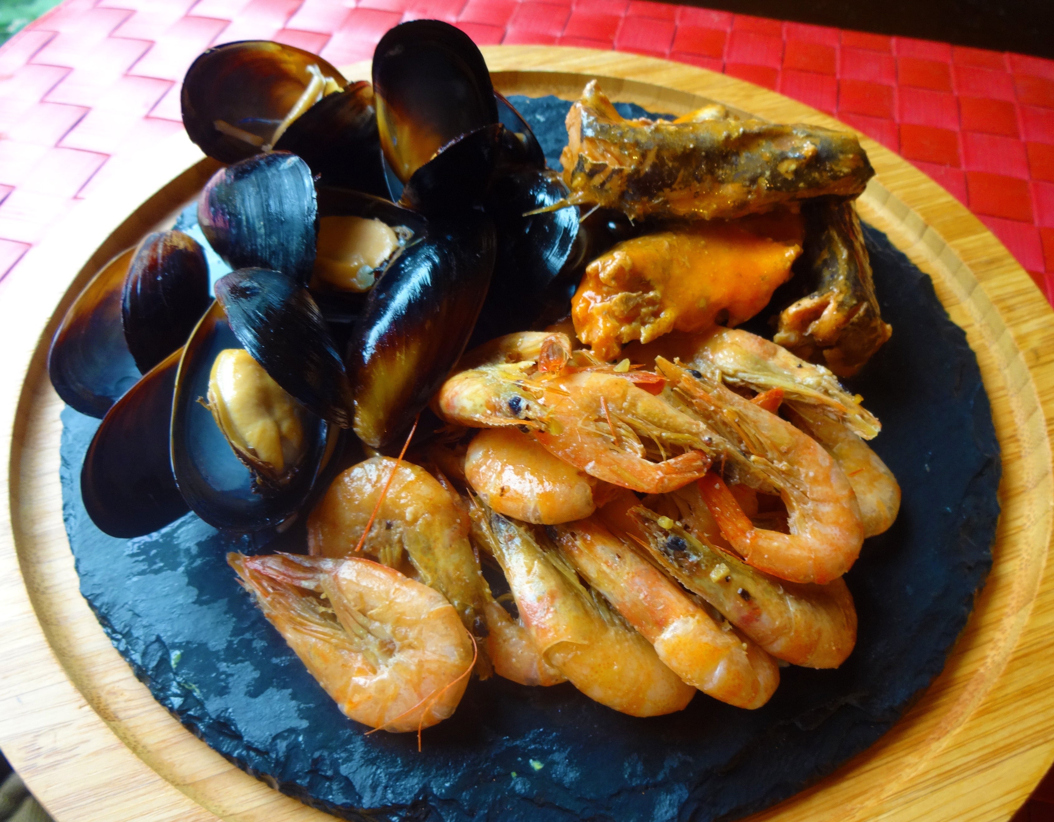 フライドシュリンプ、ムール貝、サバのトマト煮を盛り合わせたお得なシーフードプレート