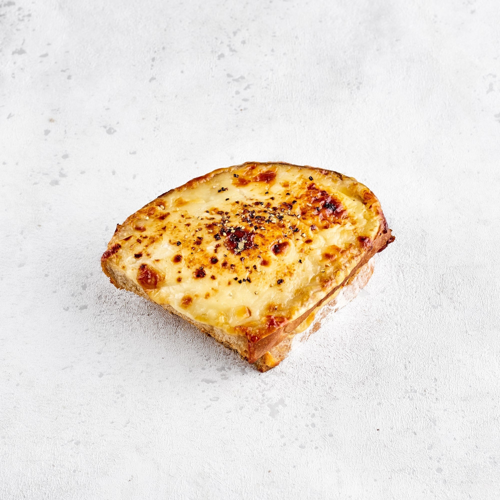 説明:濃厚なベシャメルソースと香り高いスモークベーコンをカンパーニュでサンドし焼き上げました。こんがりと焼けたチーズのコク深さが広がります。