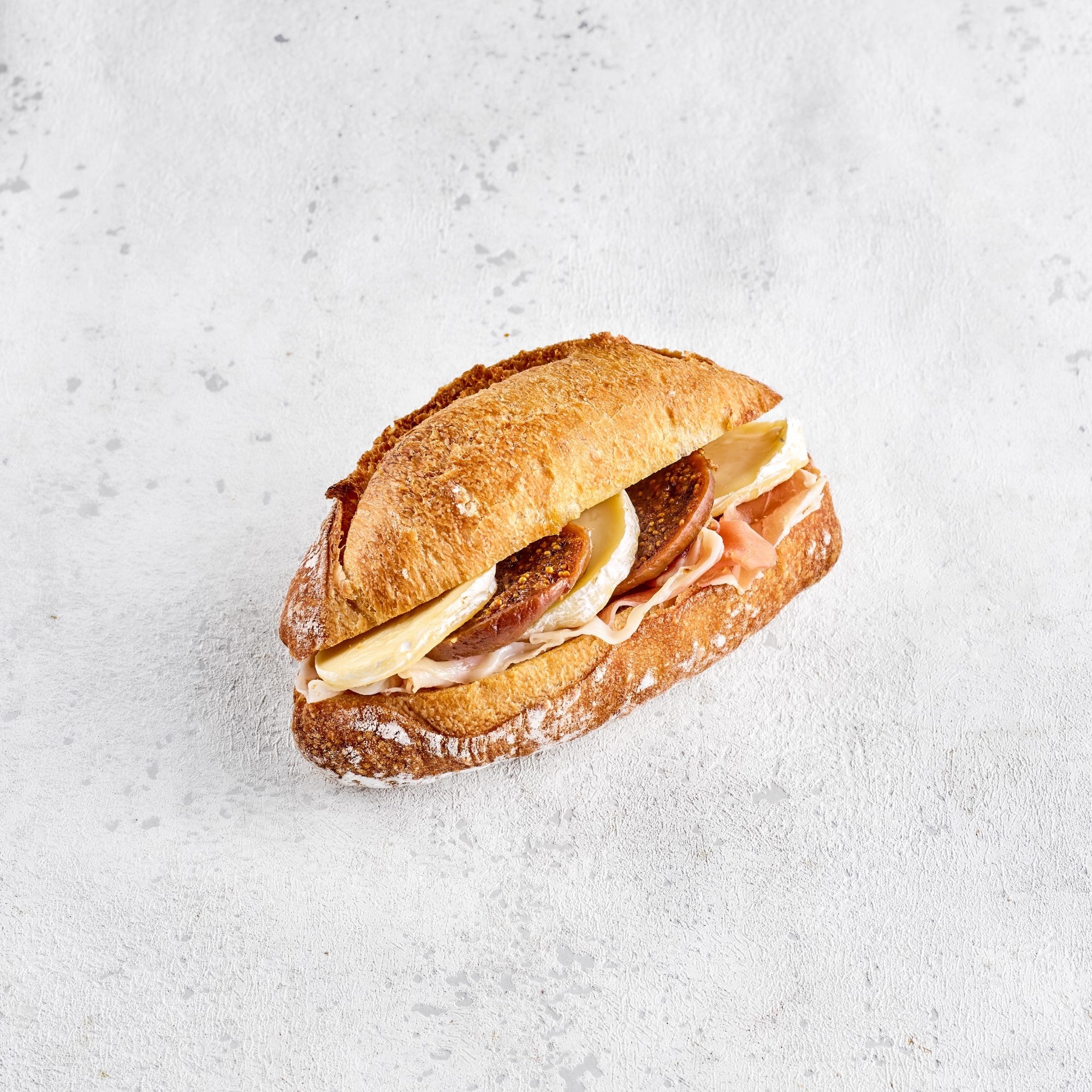 説明:ブリーチーズが主役のバゲットサンド。セミドライフィグと生ハムのシンプルな組み合わせで、お酒にも相性抜群です!