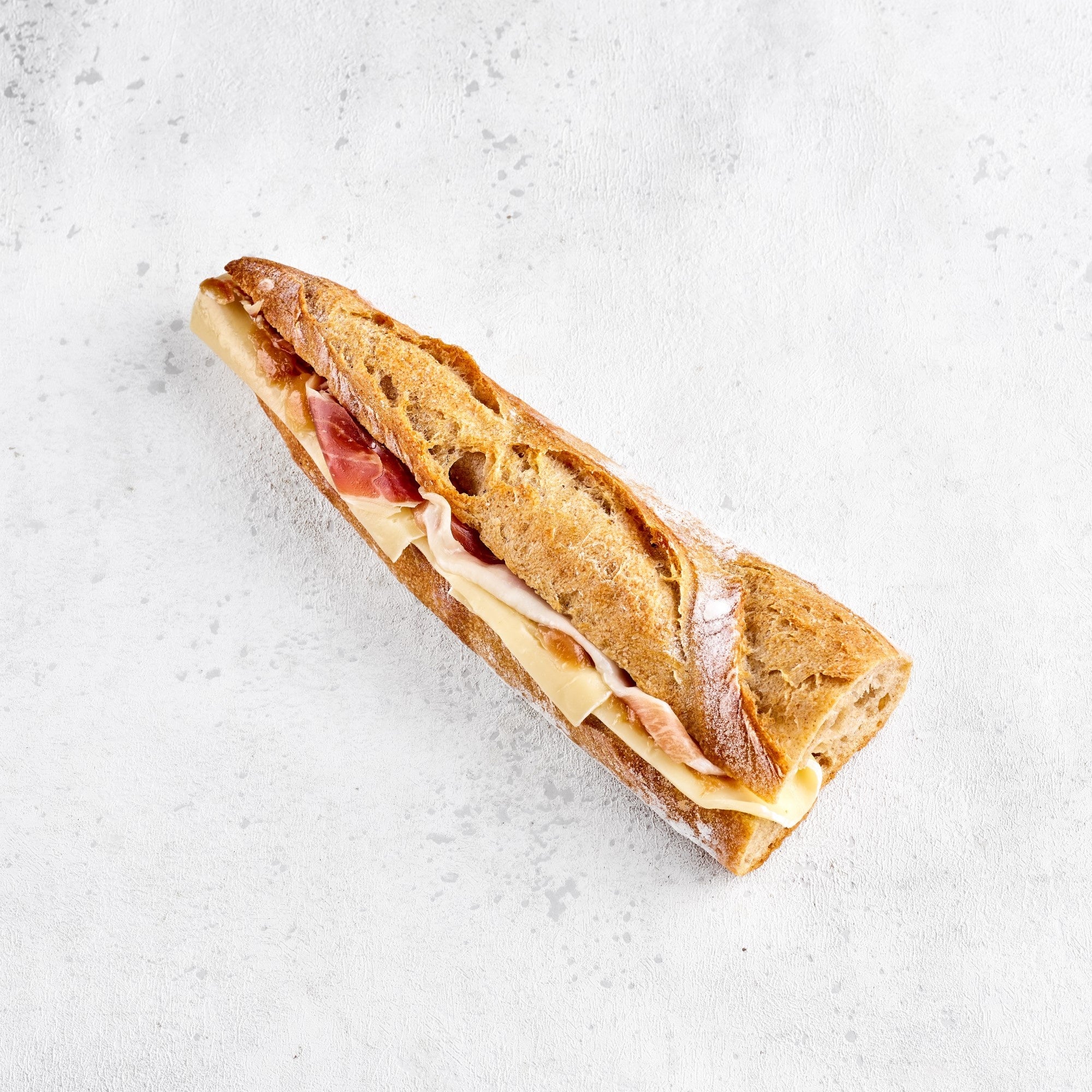 説明:オリジナルバゲットにブリーチーズと生ハムをはさんだ桃ジャムがアクセントの逸品です。