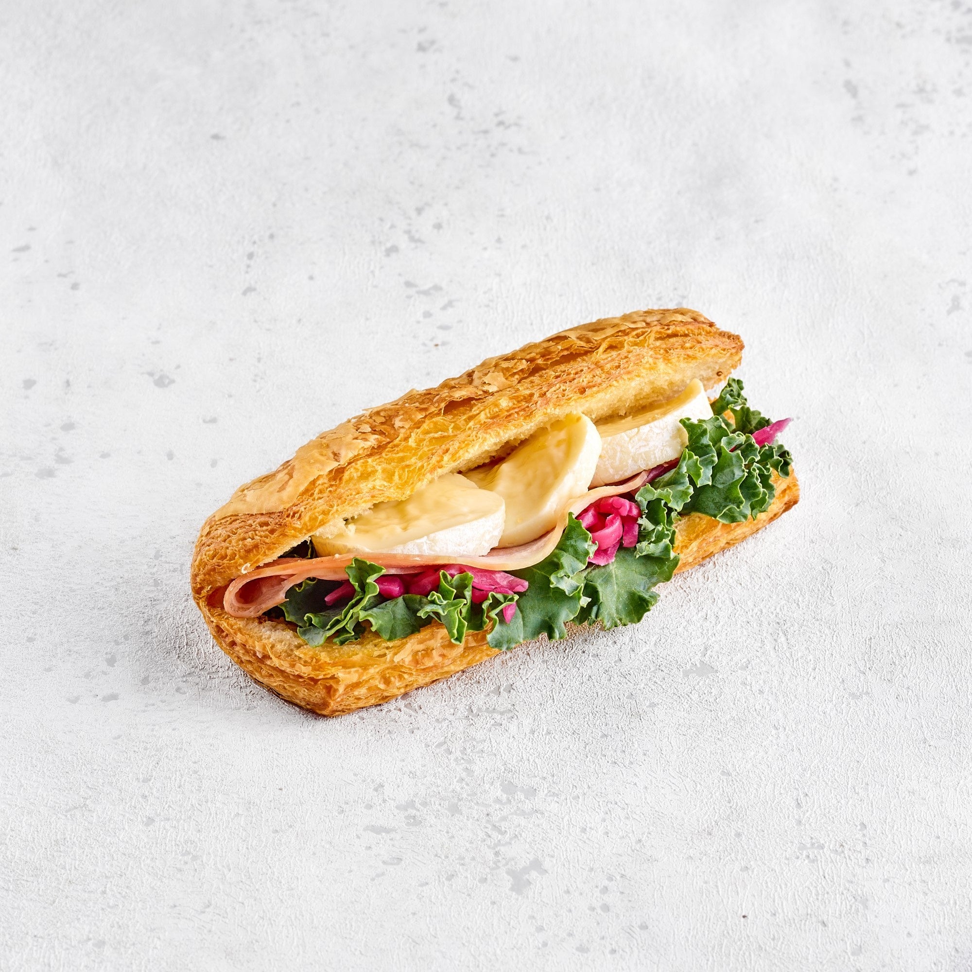 説明:当店自慢のクロワッサン生地にカマンベール・紫キャベツのラペ・ケール・スモークロースハムをサンド。ピクニックにもぴったりの色鮮やかなサンドウィッチです。