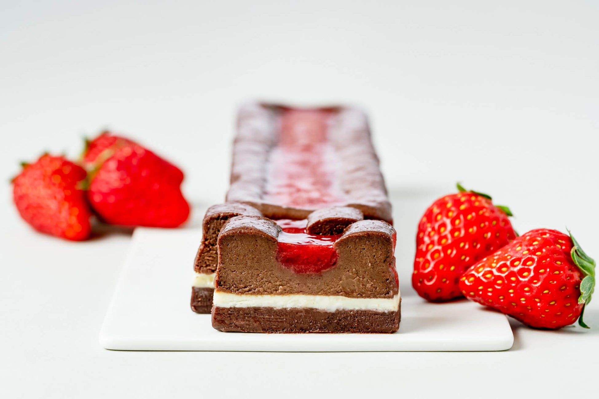 苺の酸味に寄り添うよう、果実味が特徴のタンザニア産カカオ豆をセレクトし、3層のチョコレートに仕上げています。上部は、苺ジャムとの火入れのバランスを追求した生ガトーショコラ、中間層には自家製のフレッシュなカカオバターを使った、甘さのバランスを整えるホワイトチョコレートを用いています。さらに下層は、なめらかな口溶けで食感に変化をもたらすテリーヌとしました。