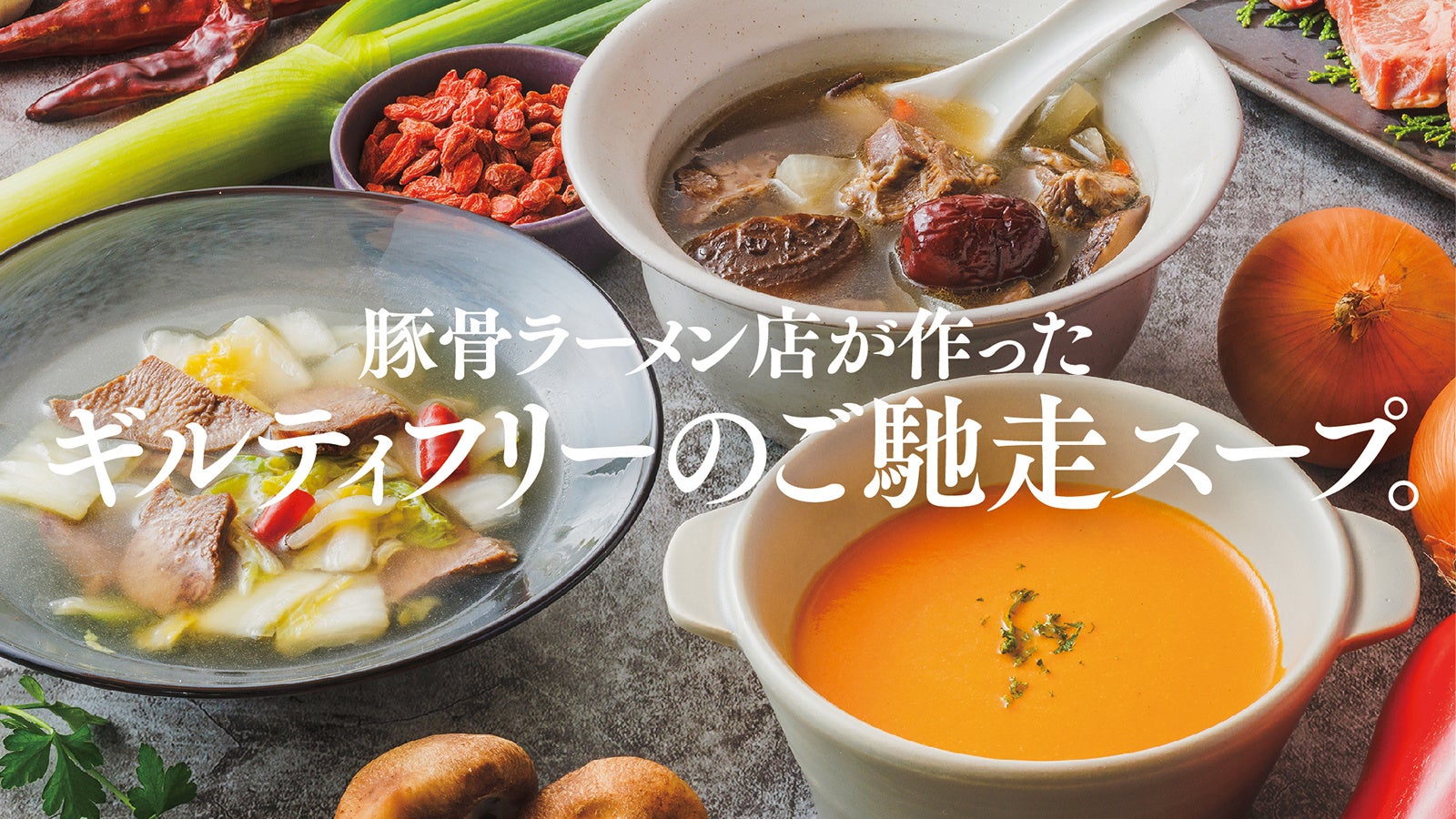 ボーンブロスという骨付き肉と野菜をじっくり煮込んだ旨味と滋養たっぷりのスープをベースに、添加物不使用でかつ塩分控えめながらも、らーめん等のような満足度の高い美味しい食事を目指して開発しました。高栄養かつコラーゲンたっぷりなので、健康や美容に気をかけている方にも嬉しい「飲みほす喜び」を感じながら健康へ向かえる「ギルティフリーのご馳走スープ」です。