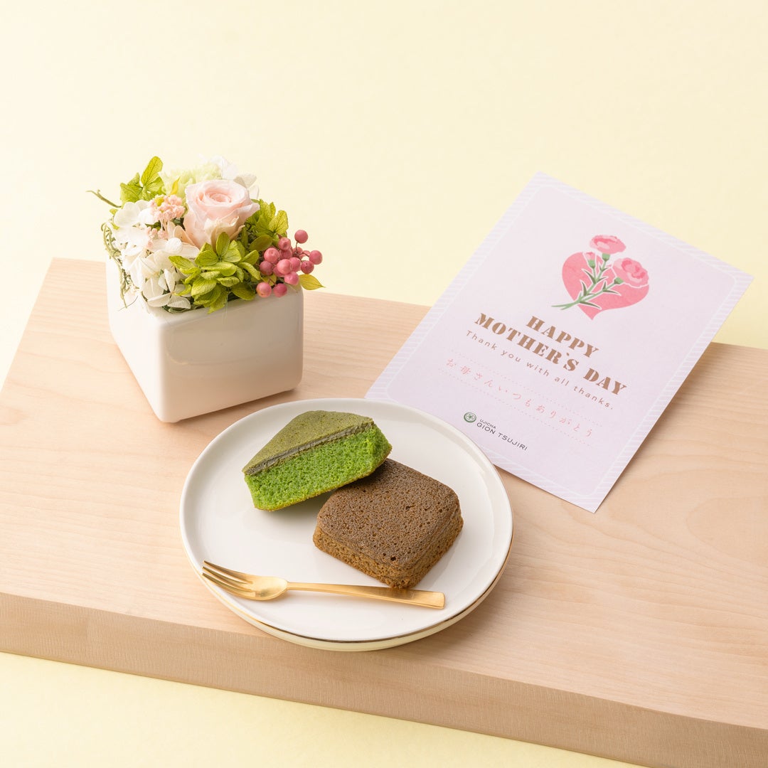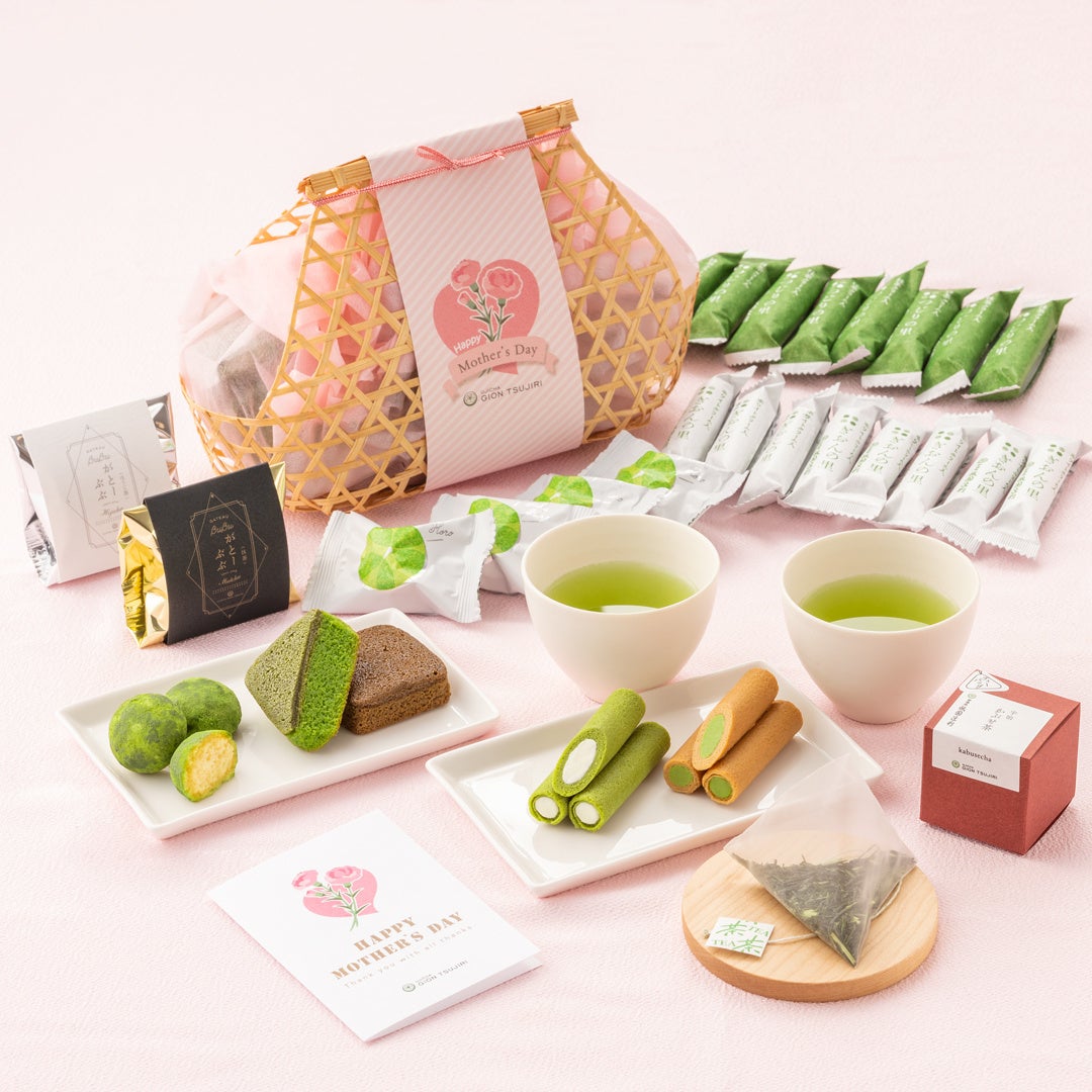 なかでもおすすめは、今年の新商品である、毎日のちょっとした幸せな時間、様々な種類のお菓子が特別にアソートセットされた「母の日竹かごギフト」。本セットはリラックスに作用する成分「テアニン」 を比較的多く含む「かぶせ茶」のティーバッグに、上質な濃厚抹茶クリームが人気の祇園辻利No.1抹茶菓子「つじりの里」と「ぎおんの里」、人気の和フィナンシェ「がとーぶぶフィナンシェ」、サクほろクッキー「POLCOCON」など、全4種のお菓子をアソート。竹かごに期待感と満足感をギュッと詰め込み、、大切なお母さんへの“愛と感謝”を表現しました。