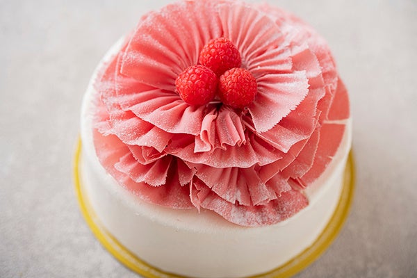 さわやかな味わいのレアチーズケーキの上に、フルーティーでほのかな酸味が特徴のルビーチョコレートを薄くのばして削ったものを丁寧に重ね合わせて飾り、カーネーションに見立てました。母の日の贈り物にぴったりの、華やかでエレガントなデコレーションケーキです。