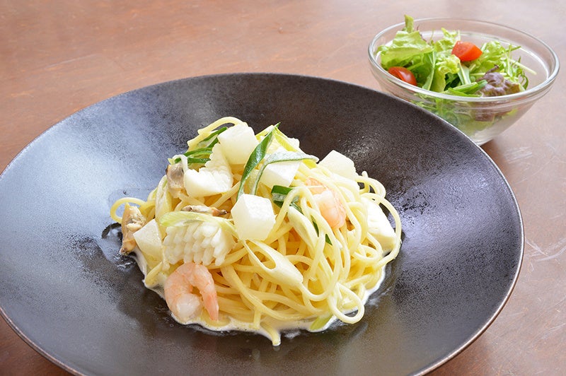いか・えび・あさりと季節の野菜がゴロゴロ具だく さん。白みそと和風だしを効かせたクリームソースが 味の決め手です。