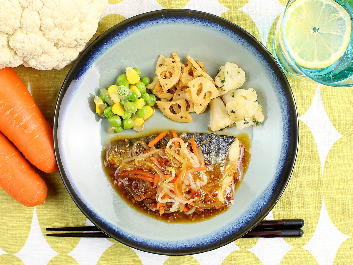 ふっくらとローストしたサバに、ピリッと辛いラー油が効いた醤油、ねぎ、ごまをたっぷりと使用したタレをかけました。もやしと人参を添えておりますのでタレとよく絡めてお召し上がりください。