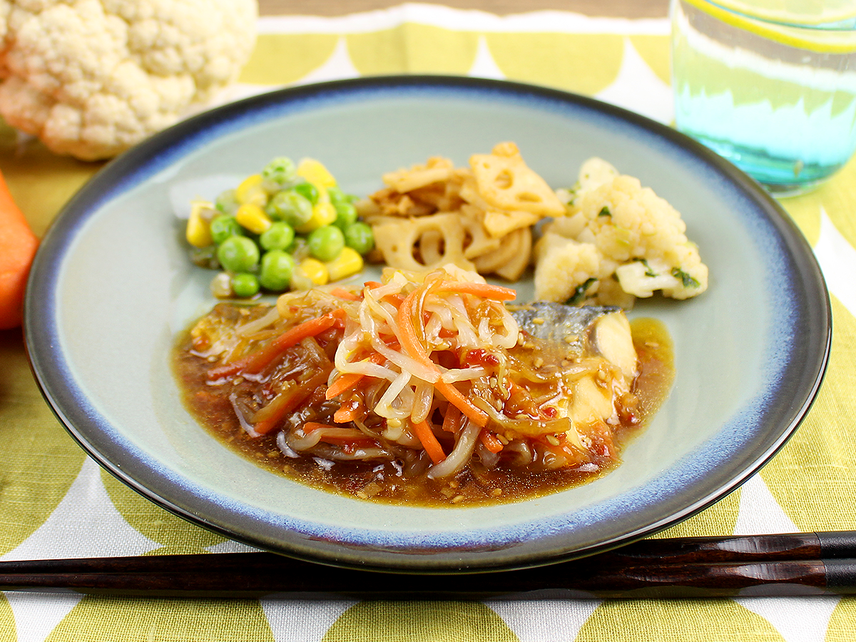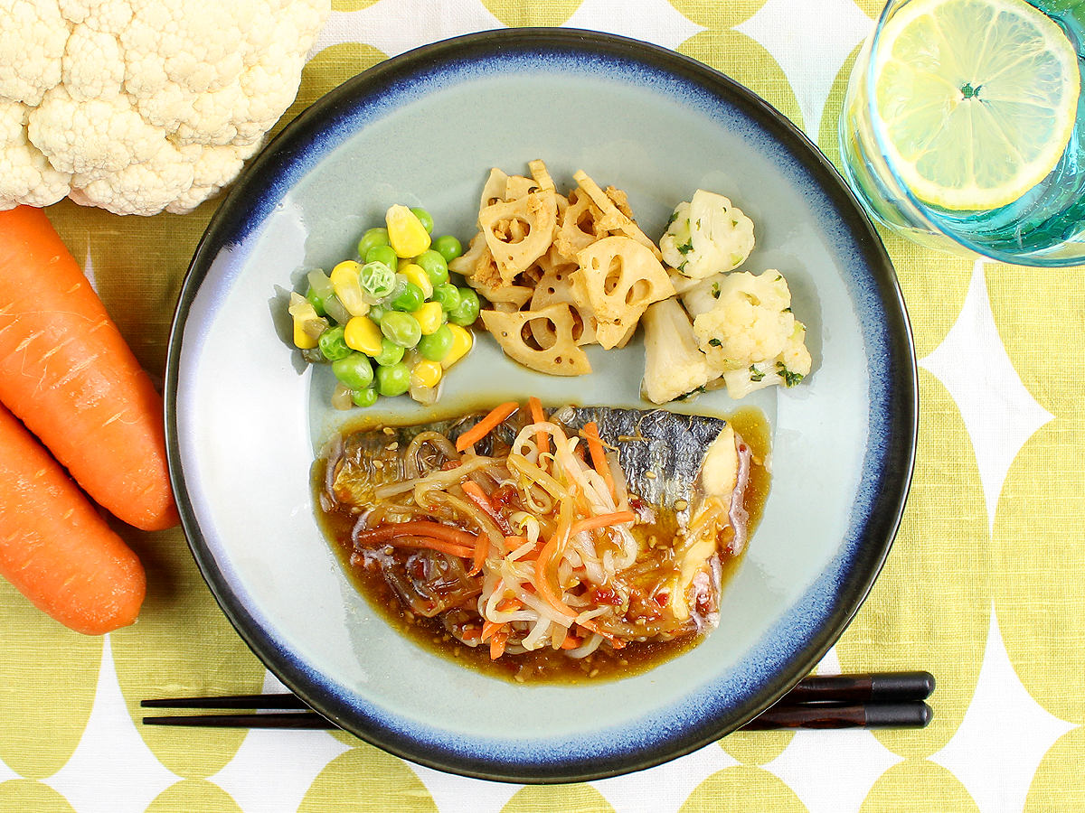 ふっくらとローストしたサバに、ピリッと辛いラー油が効いた醤油、ねぎ、ごまをたっぷりと使用したタレをかけました。もやしと人参を添えておりますのでタレとよく絡めてお召し上がりください。