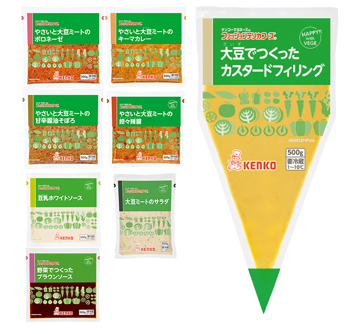 乳製品や卵、肉類を使わず、植物性原料を中心に仕上げたプラントベースのシリーズ。野菜を食べることで心も体もうれしくなるような新しい「食の楽しさ」や「食スタイル」をご提案する商品です。今回ご試食をご用意している2023年2月発売の新商品「大豆でつくったカスタードフィリング」は豆乳の優しい甘味を活かしたカスタードフィリングです。豆乳と大豆ペーストのまろやかな風味にカシューナッツペーストのコクが広がります。絞りやすさを実現した適度な粘度で三角袋形態なので、線引きやトッピングにおすすめです。