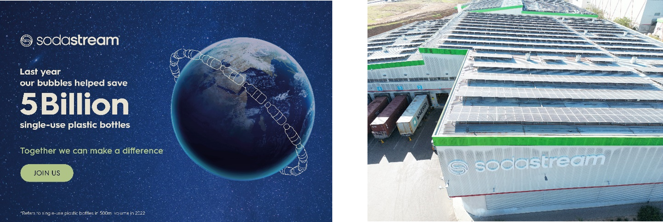 そして2023年現在、ドイツ、オーストラリア、オランダにあるソーダストリームの工場は全て再生可能エネルギーで稼働しています。工場の屋上の75%以上にソーラーパネルが設置されており、今年から工場の年間消費電力の約15%がソーラーパネルでまかなわれます。また、工場の冷却水を再利用することで年間使用水量の8.3%を削減することができます****。